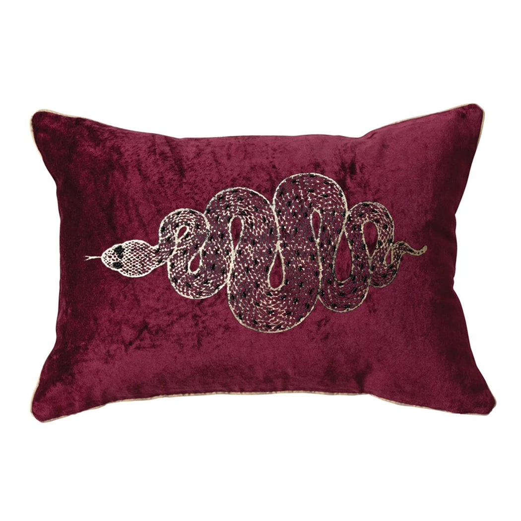 With its sophisticated deep maroon velvet, gold snake embellishment, and decorative beads, this pillow will be the perfect accent piece in any home!