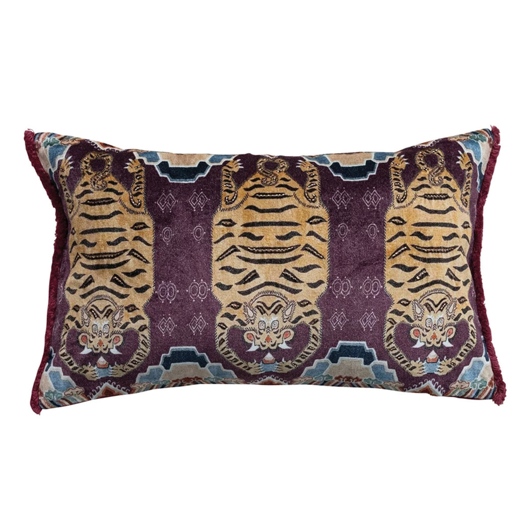 Velvet Tibetan Tigers Lumbar Pillow w/ Beads