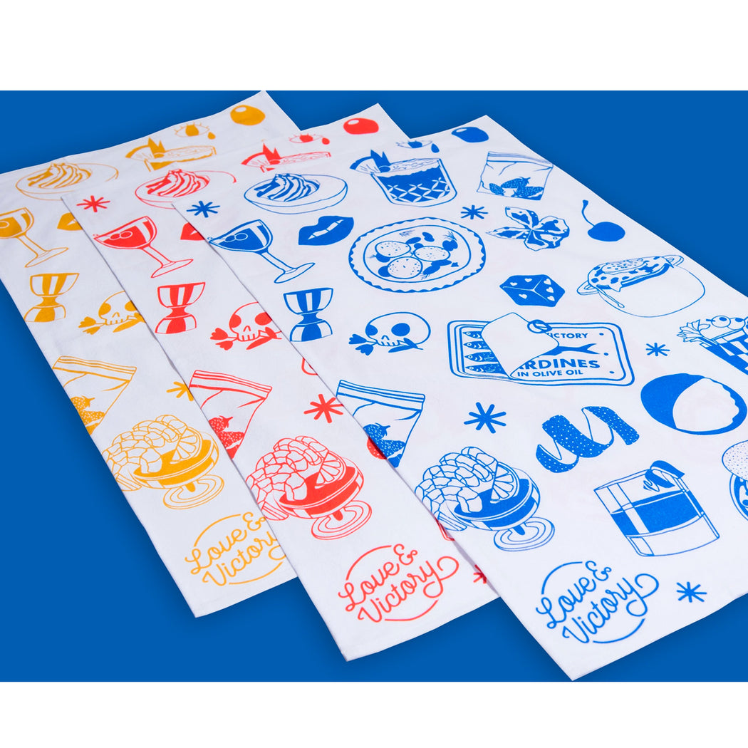 Spice up your kitchen with our vibrant and playful Love & Victory tea towels, adding a touch of color and whimsy to your daily routine.