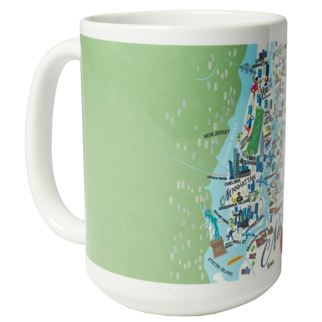 We love this whimsical artwork on a mug featuring New York City. 15-oz. durable ceramic coffee mug. Microwave-safe and top shelf dishwasher safe. 5" X 4'' X 3.5''.
