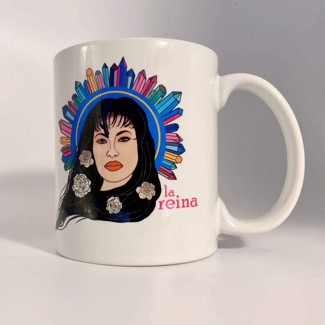 Celebrate the life and legacy of Selena Quintanilla-Pérez, La Reina de Tejano, with this colorful hand-printed mug.