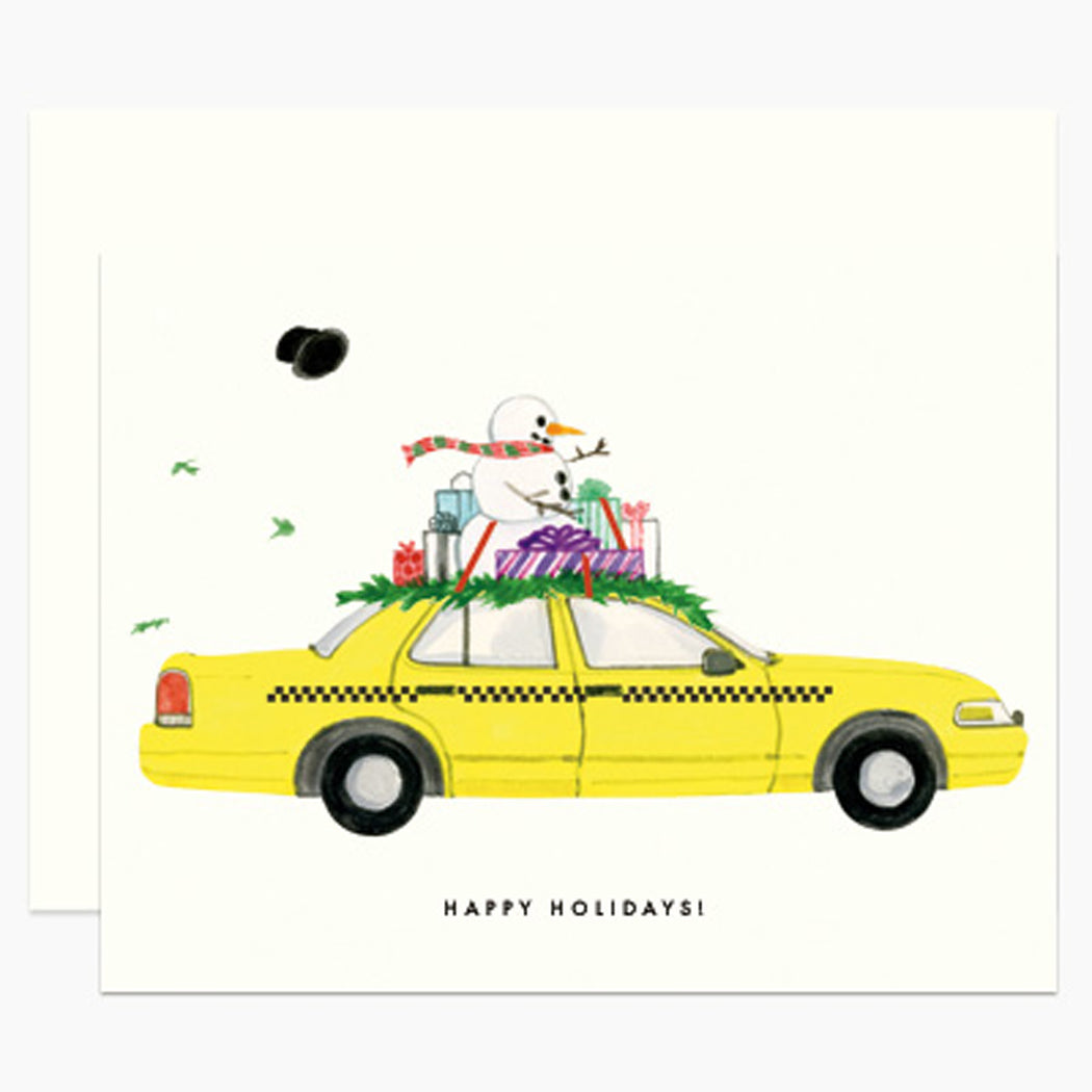 A festive hand-illustrated snowman and brightly patterned presents strapped to the top of a taxi cab with text that reads "Happy Holidays".