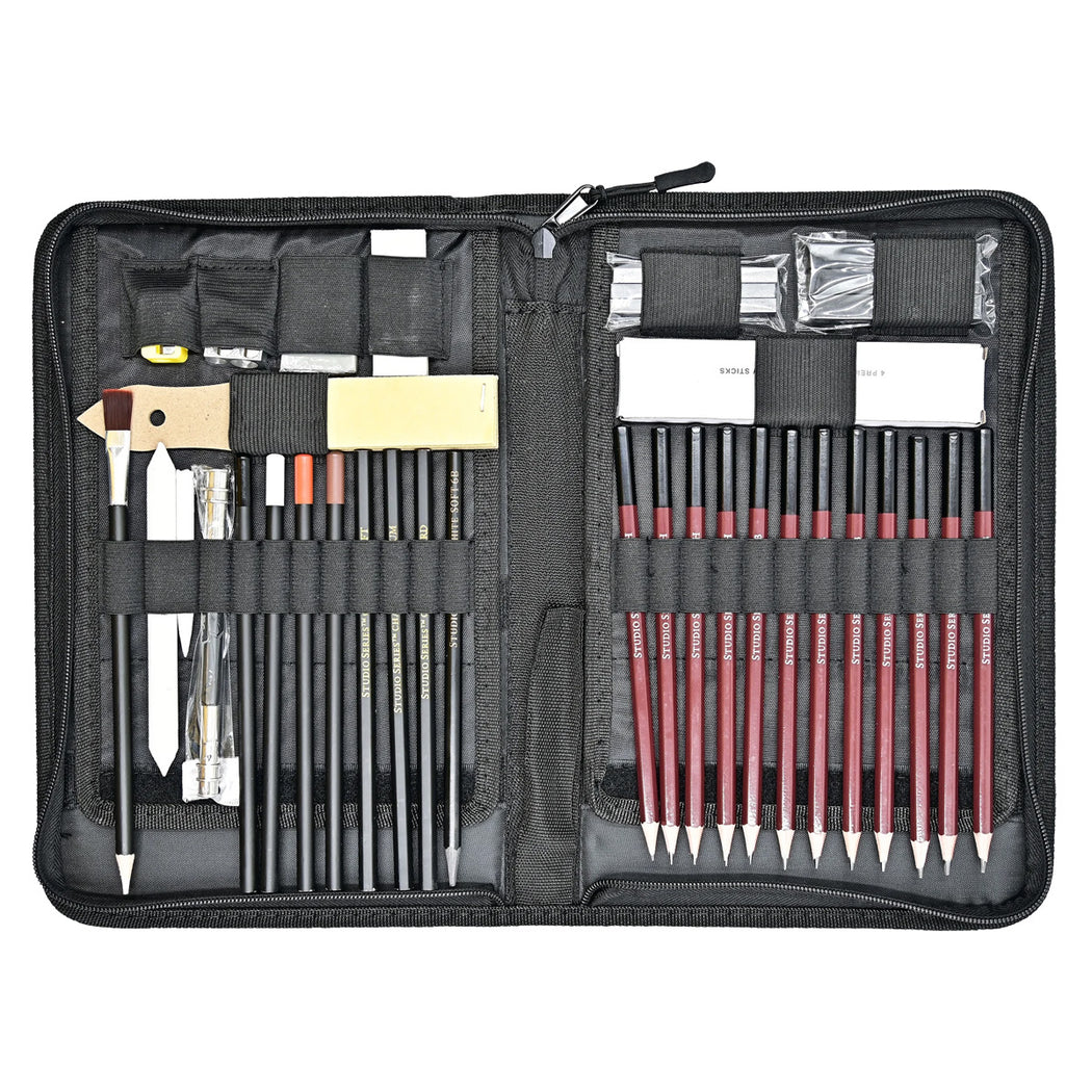 - Set includes 12 graphite pencils, 3 graphite sticks, 1 woodless soft graphite pencil, 1 plastic/vinyl pencil eraser, 1 pencil extender, 3 charcoal pencils, 3 charcoal sticks, 4 charcoal willow sticks, and 1 kneaded charcoal eraser.