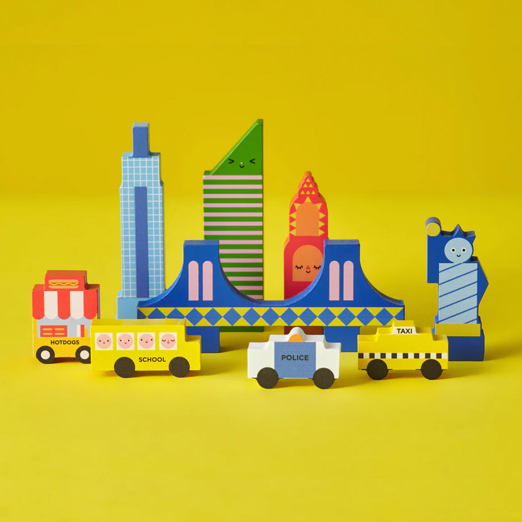 Adorable mini wooden city with iconic buildings and landmarks. 9 pieces with a cotton bag. Portable and convenient!