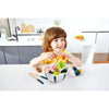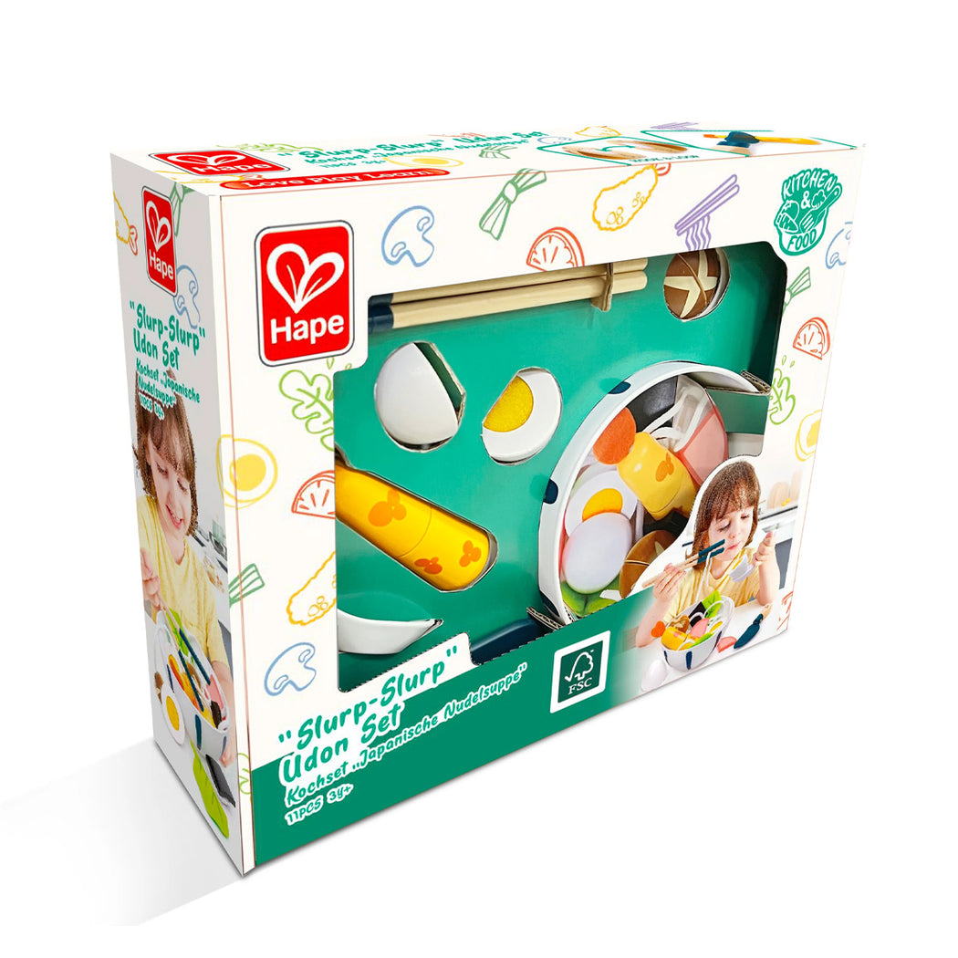 This set includes one bowl, one pair of chopsticks, two green vegetables, one tempura shrimp, two fish cakes, two pieces of seaweed, one egg, one mushroom, noodles, one knife and one spoon. The safe plastic knife allows your child to cut the egg, shrimp, or mushroom into two pieces and then place them in the bowl to stir together with the chopsticks. This toy is a great way to encourage little ones to imitate grown-up behavior while also having fun. Use the chopsticks and spoon to enjoy your delicious bowl of soup.