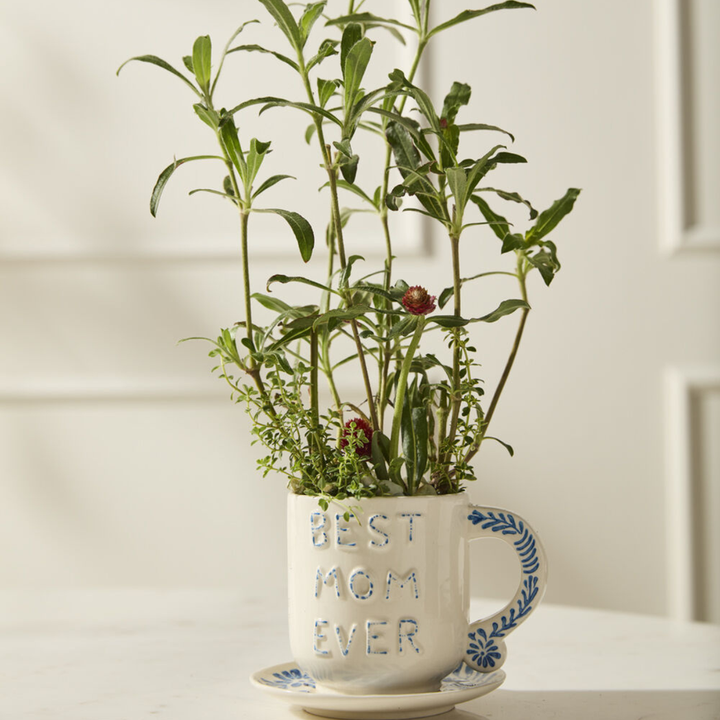 This versatile mug makes for the perfect Mother's Day gift. Featuring hand cut & applied lettering on the front with blue and white detailing, and a matching blue leaf patter on the handle and saucer.