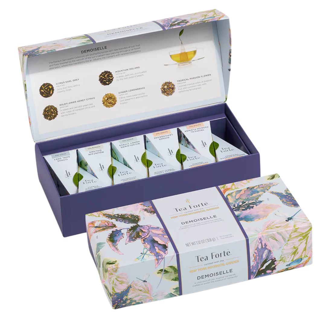The Demoiselle Petite Presentation Box contains 10 pyramid infusers, two of each blend: Citrus Earl Grey(black tea), Mountain Oolong (oolong tea), Wildflower Honey Citrus (green tea), Ginger Lemongrass (herbal tea), and Tropical Passion Flower (herbal tea).