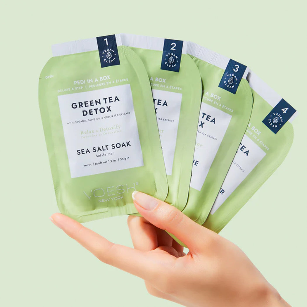 Comes with: 1 sea salt soak, 1 sugar scrub, 1 mud masque, 1 massage butter, 1 dual-grit nail file