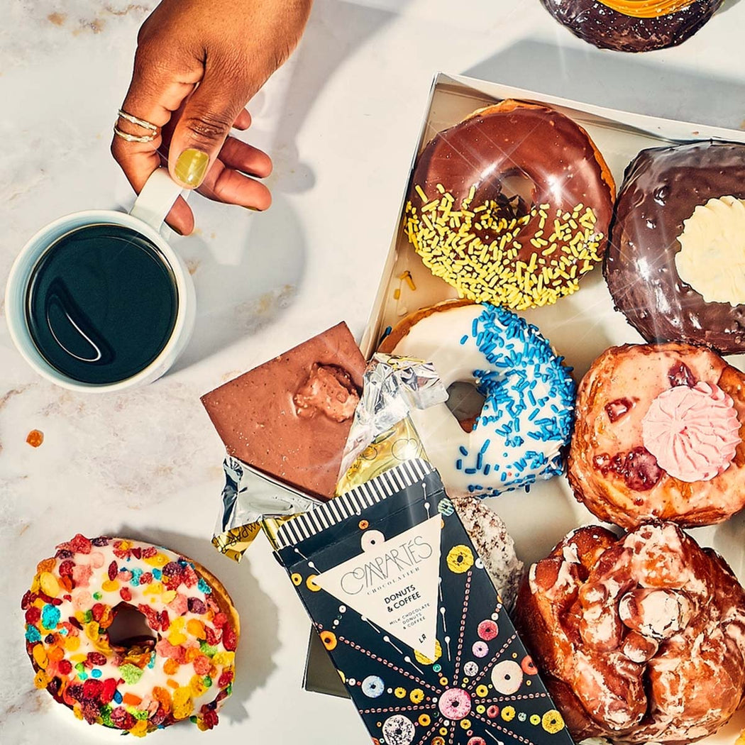 - Compartés signature creamy milk chocolate featuring actual donuts & coffee sourced from LA
